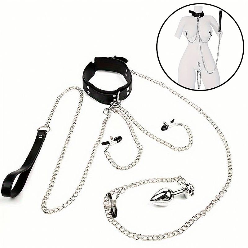 Coleira bondage com grampo de mamilo e plug anal, ajustável por meio de fivelas metálicas, confeccionada em couro sintético.