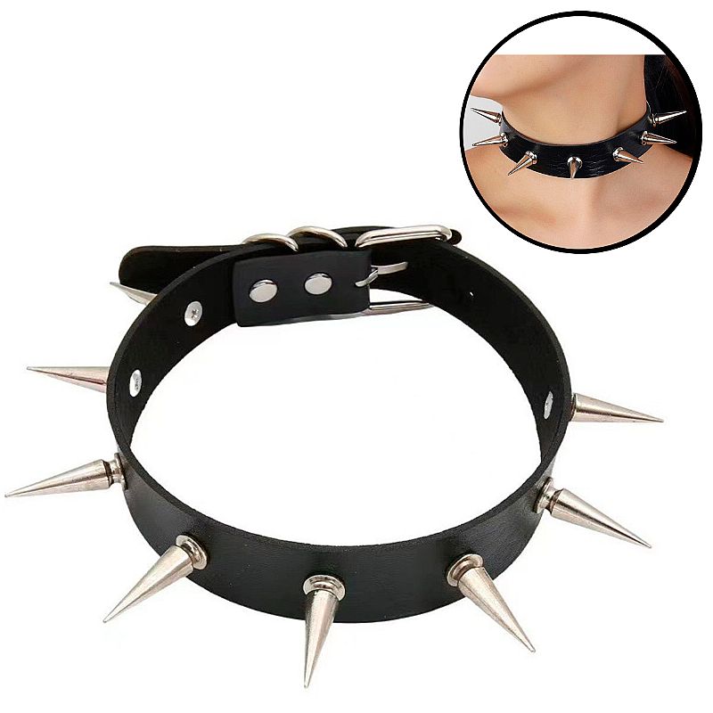 Coleira bondage ajustável por meio de fivelas metálicas, confeccionada em couro sintético.