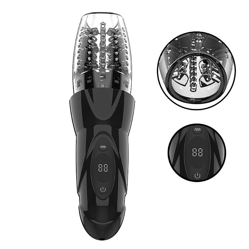 Masturbador masculino com formato de lanterna para glande - possui 8 modos de vai e vem. 10 modos de vibração e 8 modos de rotação.Tela de Led.