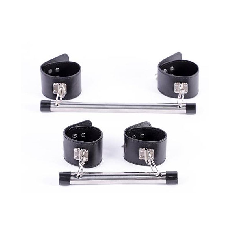 Estes dois pares de algemas em nylon unem os punhos e os tornozelos por uma barra de aço super-resistente. Imobilização total e entrega aos prazeres da submissão.