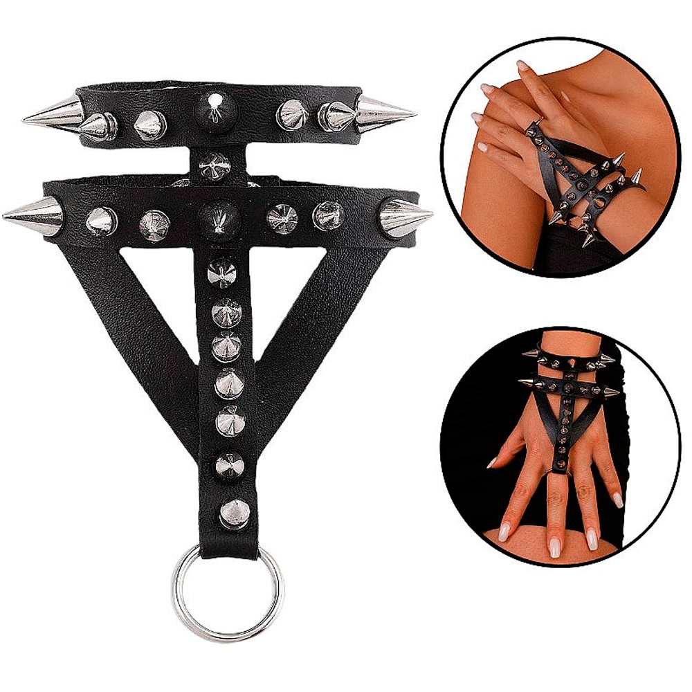 Pulseira de spike confeccionado em couro sintético com detalhes em rebite e fivelas para ajuste que prendem a peça.
